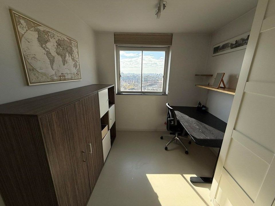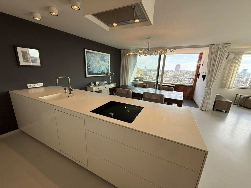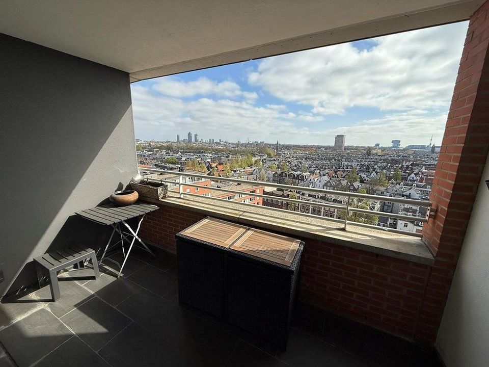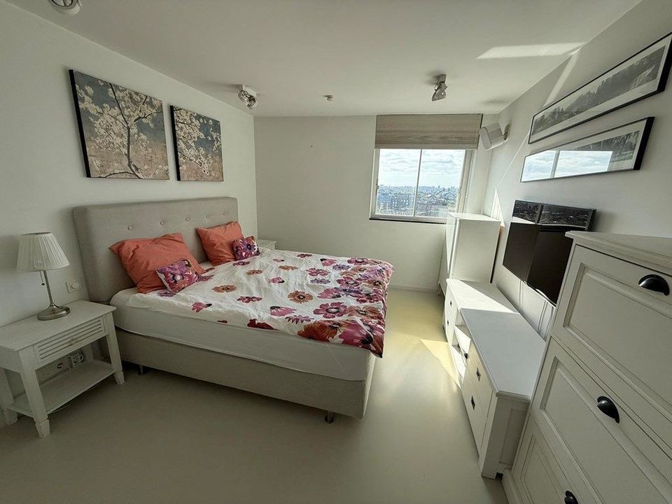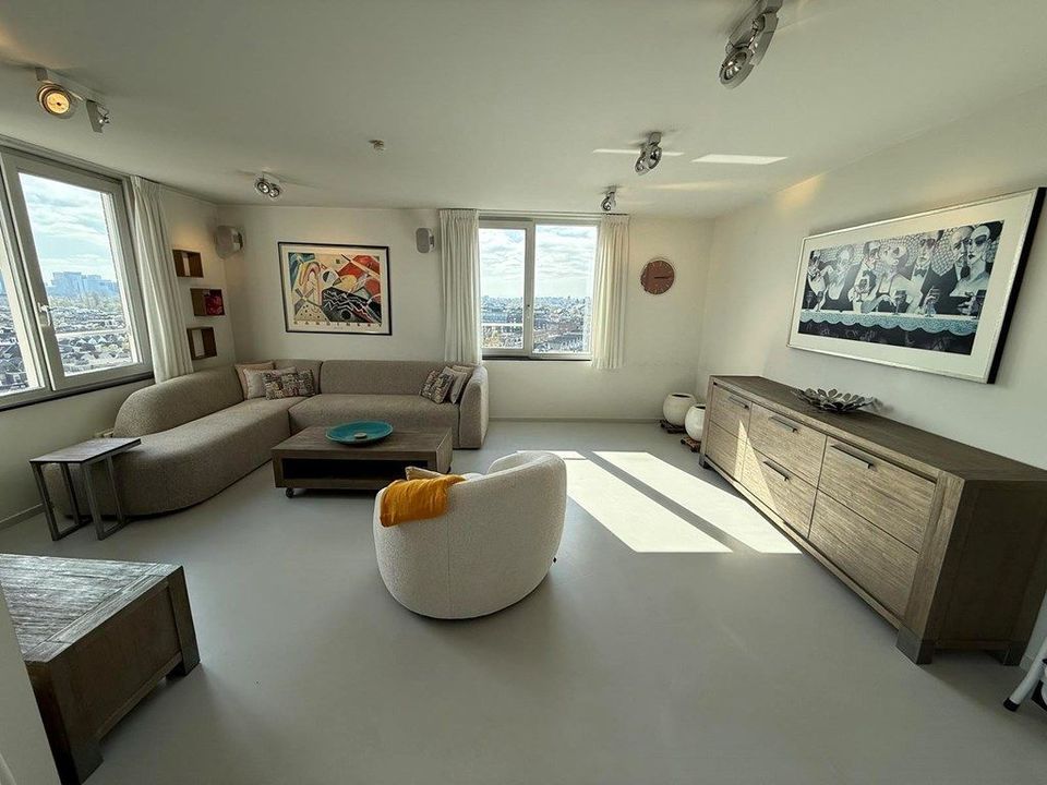 Experience unparalleled Amsterdam living in this meticulously furnished 105 m² apartment. Perched on the 12th floor, it boasts breathtaking panoramic city views, particularly from the south-facing balcony. The residence features two bedrooms, a luxurious bathroom with a soaking tub and separate shower, and a state-of-the-art Gaggenau kitchen—complete with every high-end appliance imaginable.