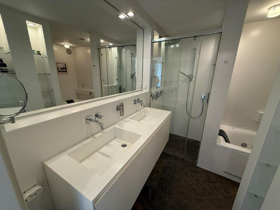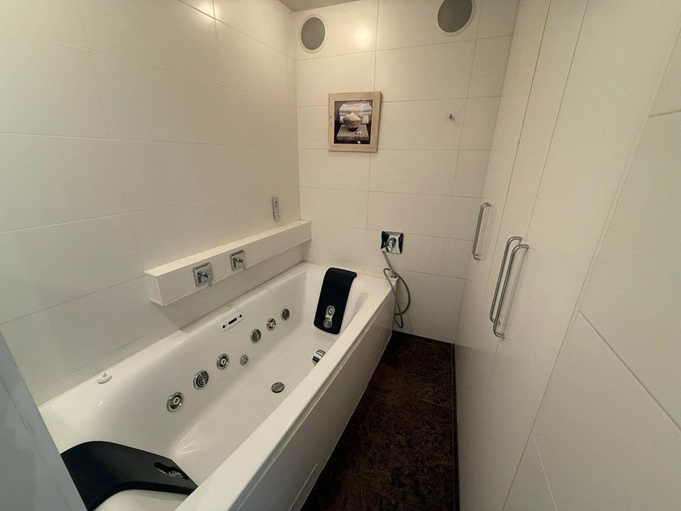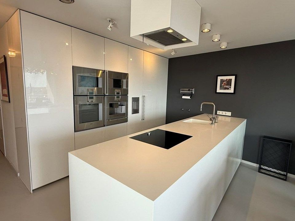 This stylishly designed apartment offers quality, luxury and a spectacular view over the south part of the city. The spacious (40 m2) living room is bright and offers a modern, oak dining table and a large wall-mounted flat screen television with high quality sound system. Sunny and spacious balcony facing south. The beautiful white, -Corian- kitchen is fully equipped with only the best appliances (-Gaggenau-) - a large oven, microwave oven, steamer, coffee maker, dishwasher, super large fridge and freezer, ice maker, cooled water tap, steaming water tap. A modern epoxy flooring with floor heating is super comfortable and is present in every room. The bathroom with double basins is equipped with a luxurious, extra-large bath including -Jacuzzi-, flat screen television and lighting. -Miele- washing machine with steam option and -Miele- dryer. The separate shower offers both a rain shower and a regular shower head. Separate toilet with hand basin. Spacious master bedroom equipped with wall-mounted flat screen television, high quality speakers and blu-ray player. Two spacious side-by-side closets. The second bedroom offers a bed that can be extended to a double bed, a desk and ample storage space.