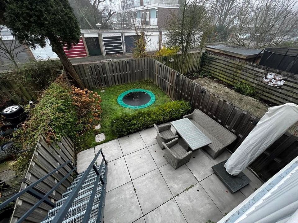 With a living area of 120 m², it offers plenty of space and comfort. The first floor boasts a lot of natural light through its large windows and an open living space that combines the sitting, dining, and open kitchen areas. The home has three bedrooms, all conveniently located on the same floor, which also hosts a modern bathroom with a walk-in shower and a separate toilet. The ground floor provides storage and laundry space, as well as a garage with two Batavus bikes ready for rides. Finally, it features an urban garden with a built-in trampoline, outdoor seating, and lighting, making it great for kids to play in or to enjoy during the warm and long Amsterdam summer nights.